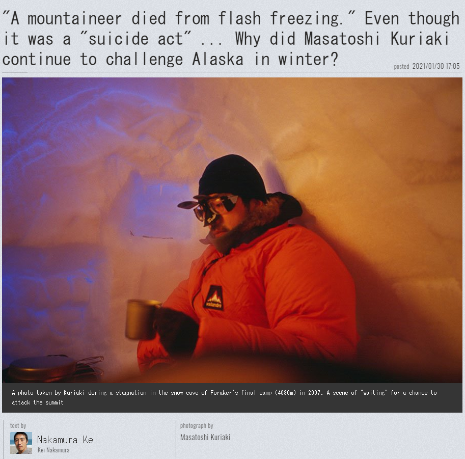Masatoshi Kuriaki (48), the youngest mountaineer in history to climb Denali (6190m, Alaska, USA) in winter, has announced his de facto “retirement.” The decision to quit the mountain was the first distress in my life in 2016. Winter Alaska has been in love for a long time. Kuriaki says, “Is it okay to climb a mountain that kills my life?” How do you spend your “Alaska-free” days? (3rd time of all 3 times / to # 1 and # 2 )