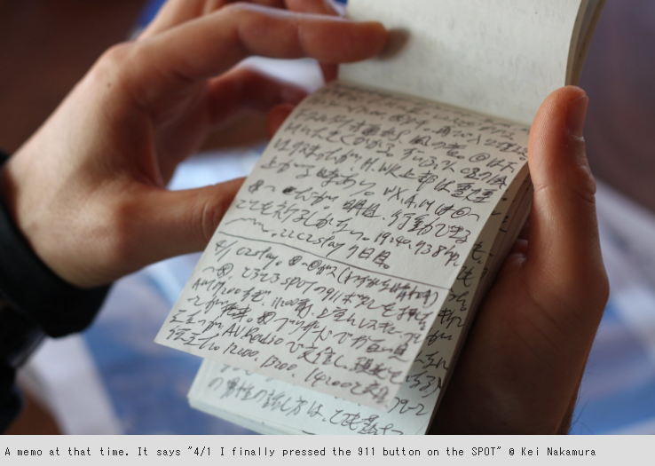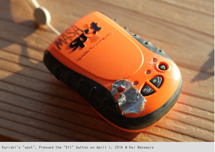 Kuriaki Spot is a product name. In the United States, many people carry it with them when they are outdoors or hunting. There are two buttons, “help” button and “911” button, and “help” is a button that you can use as if you are okay with your friends. “911” is 110 in Japan. I pushed towards “911”.