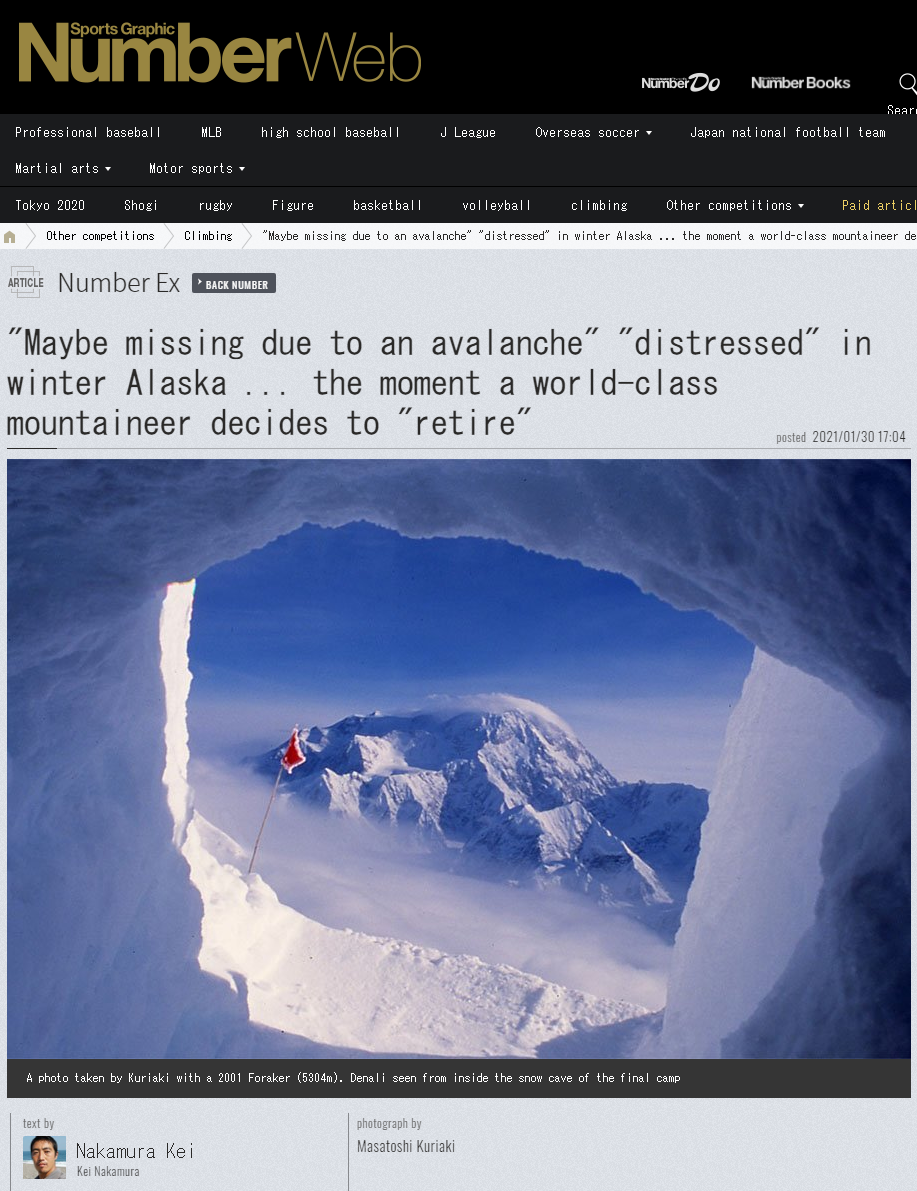 Masatoshi Kuriaki (48), the youngest mountaineer in history to climb Denali (6190m, Alaska, USA) in winter, has announced his de facto “retirement.” The decision to quit the mountain was the first distress in my life in 2016. Winter Alaska has been in love for a long time. Kuriaki says, “Is it okay to climb a mountain that kills my life?” How do you spend your “Alaska-free” days? (3rd time of all 3 times / to # 1 and # 2 )